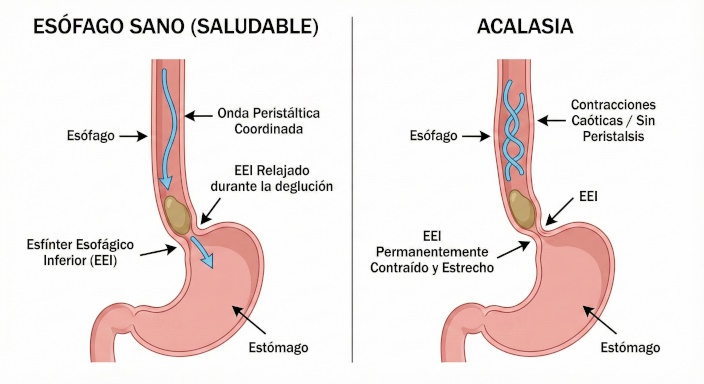 La acalasia es una patología neuromuscular crónica caracterizada por la disfunción primaria del esófago, donde se observa una alteración en la relajación del esfínter esofágico inferior (EEI) durante la deglución, acompañada de aperistalsis en el cuerpo esofágico.